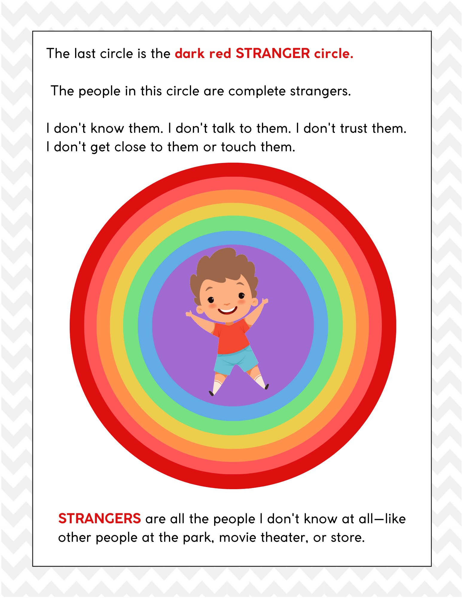 - Visuals showing different relationship circles, including family, friends, strangers, and community helpers